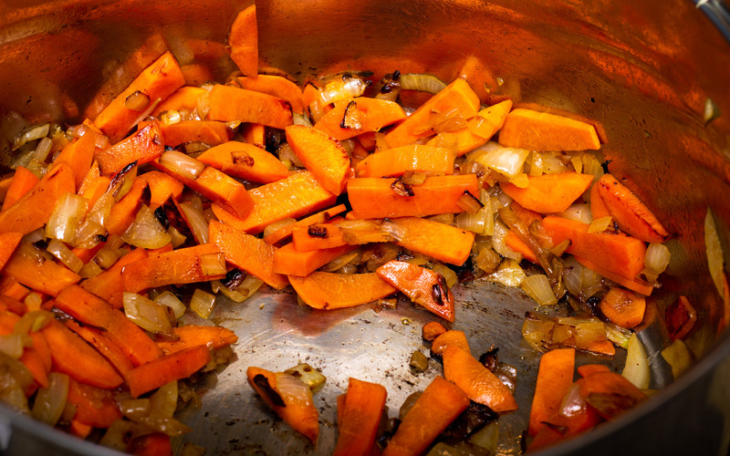 3. Pozostałe warzywa: marchewki, cebulę, seler i pietruszkę obierz, a następnie pokrój w kostkę i podsmaż na rozgrzanej patelni z masłem lub smalcem.