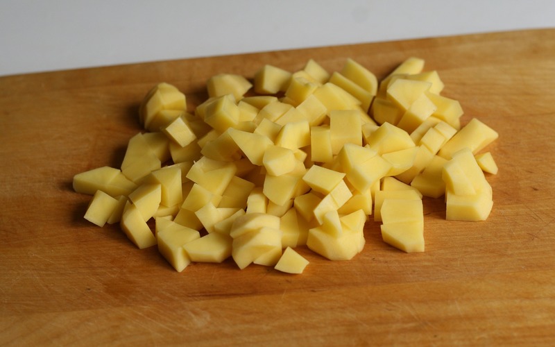 5. Ziemniaki obierz, umyj, pokrój w kostkę i ugotuj do miękkości w lekko osolonej wodzie. Ugotowane ziemniaki odcedź i dodaj do garnka z kapustą, razem z prosem i podsmażonymi wcześniej warzywami.