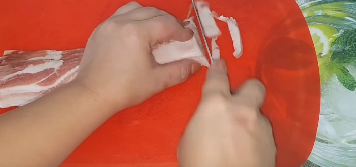 8. Podczas gotowania się klusek, możesz pokroić drobno boczek oraz obraną cebulkę. Rozgrzej olej na patelni, następnie smaż na nim cebulkę oraz boczek.
