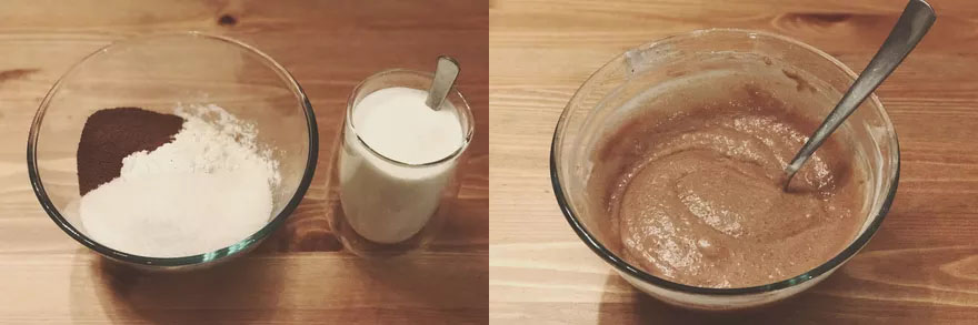 1.Do miski wlej kefir, który połącz razem z sodą. Następnie dodaj kakao, cukier oraz mąkę, całość bardzo dokładnie wymieszaj.