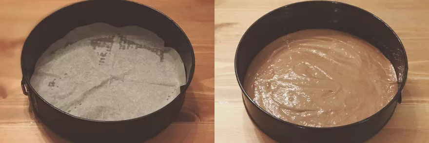 2.Do tortownicy połóż papier do pieczenia. Następnie wlej do niej przygotowane ciasto.