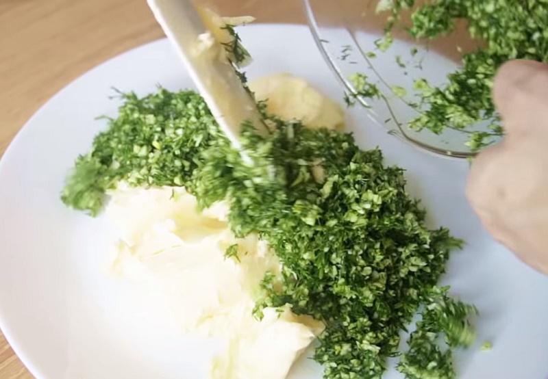 3. Z pomocą blendera, posiekaj koperek i obrane ząbki czosnku z masłem.