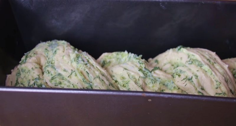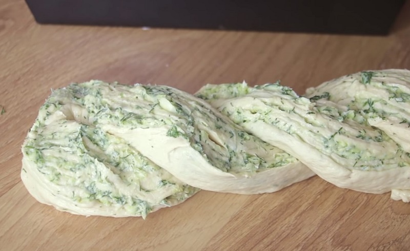 4. Gotowe ciasto rozwałkuj, wyłóż na nie przygotowane nadzienie i zawiń ciasno w rulon. Potem przetnij go wzdłuż na pół i spleć ze sobą naprzemiennie. Tak przygotowane ciasto, ułóż w formie, wyłożonej papierem do pieczenia i posyp startym na tarce o grubych oczkach serem.