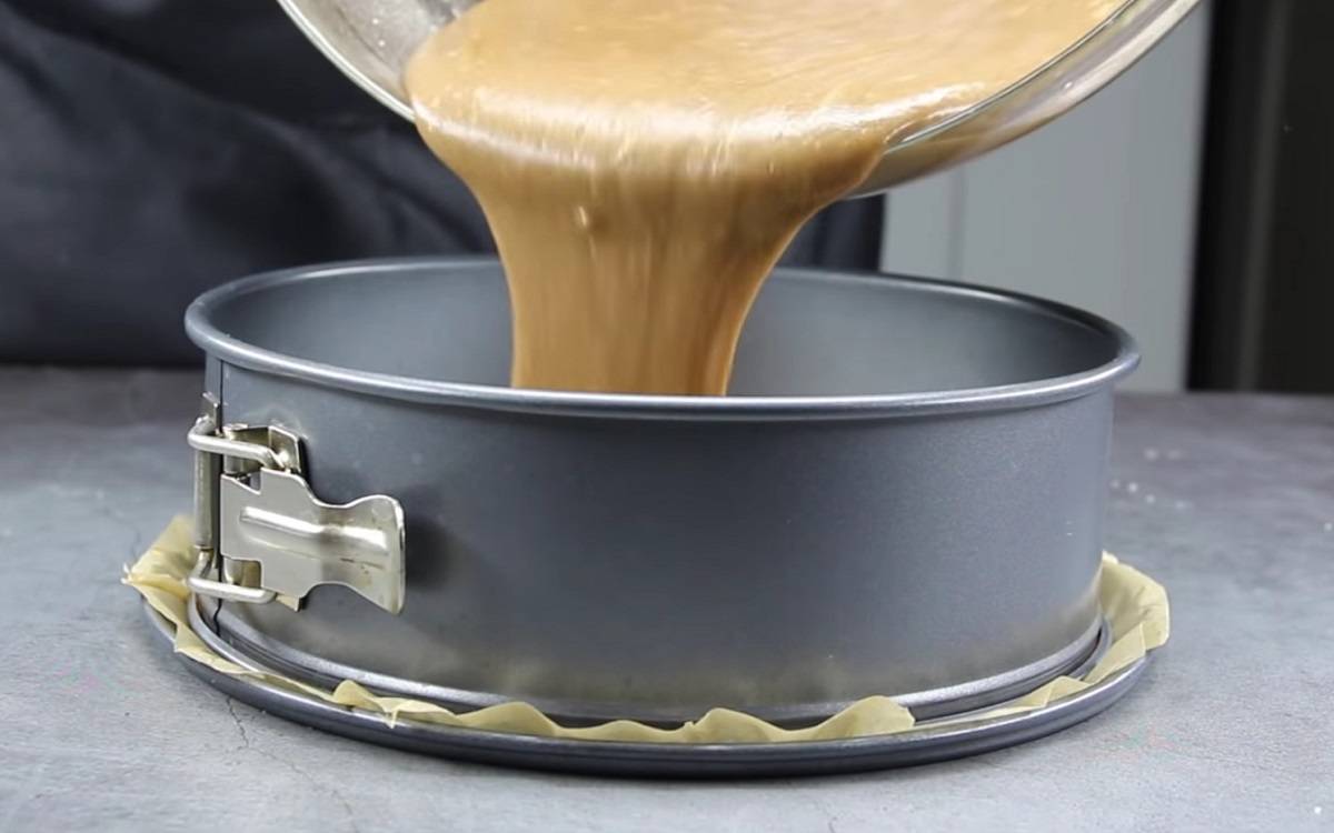 3. Blachę wyłóż papierem do pieczenia, po czym wlej na nią przygotowane ciasto i za pomocą szpatułki dokładnie wyrównaj.