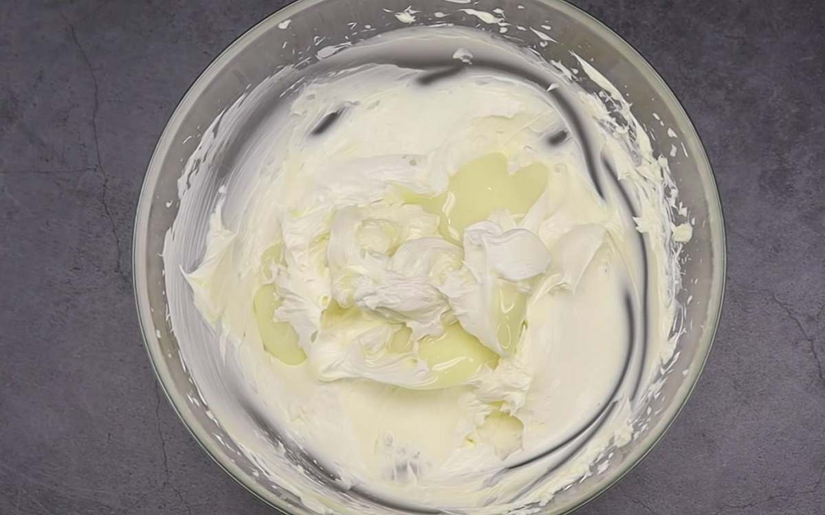 5. W między czasie możesz przygotować krem. Do miski wlej mleko skondensowane oraz dodaj miękkie masło, następnie za pomocą miksera połącz ze sobą oba składniki.