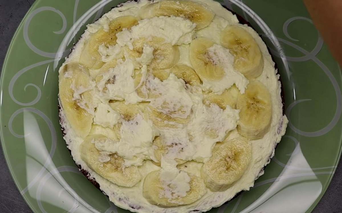 6. Upieczone oraz wystudzone ciasto przetnij na pół, po czym na dolną część połóż połowę kremu oraz pokrojonego w plasterki banana, całość przykryj drugą częścią ciasta. Resztę kremu połóż na wierch oraz boki ciasta, następnie całość posyp wiórkami kokosowymi oraz czekoladowymi. Tak przygotowane ciasto jest gotowe!