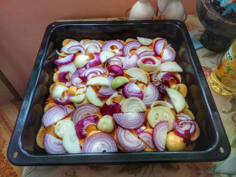2. Na warstwie ziemniaków, poukładaj obraną cebulę, pokrojoną w piórka oraz posyp boczkiem, pokrojonym w kostkę.