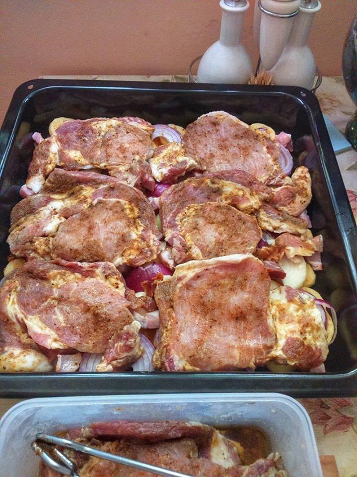 3. Na wierzchu, poukładaj marynowaną karkówkę.