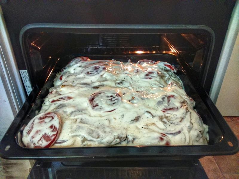 7. Kilka minut przed końcem pieczenia, zdejmij folię i zalej przygotowanym sosem. Gdy sos zbrązowieje, a danie się zarumieni – jest gotowe!