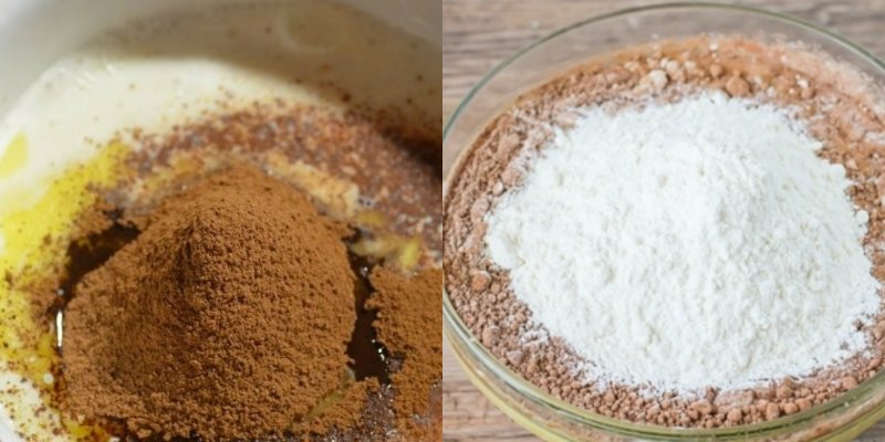 2.Po upływie tego czasu wsyp kakao oraz wlej olej słonecznikowy. Połącz ze sobą wszystkie składniki.