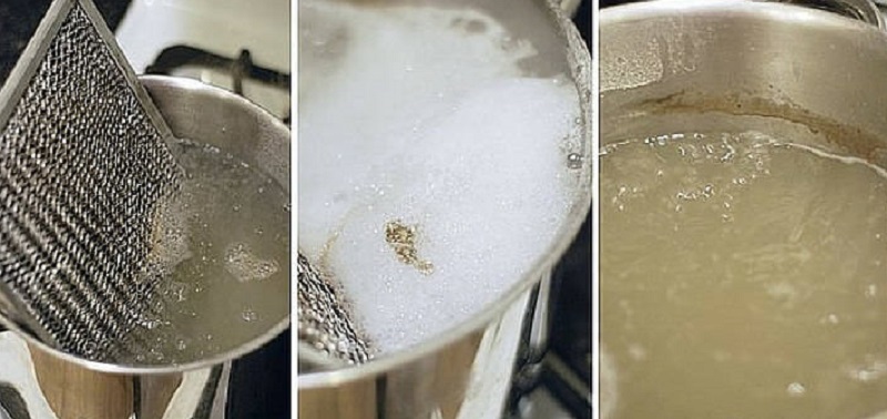 Zdemontuj kratkę, namocz ją w przygotowanym płynie i pozostaw na 15 minut. Po tym czasie tłuszcz i sadze powinny się rozpuścić, ale jeżeli nadal utrzymują się na kratce, spróbuj zagotować ją w roztworze.