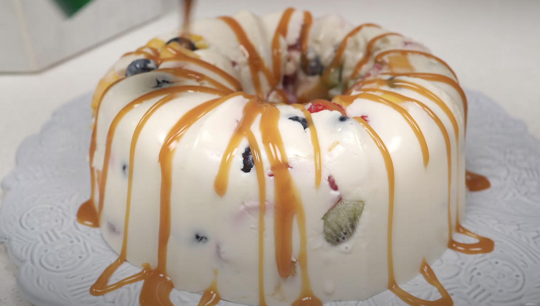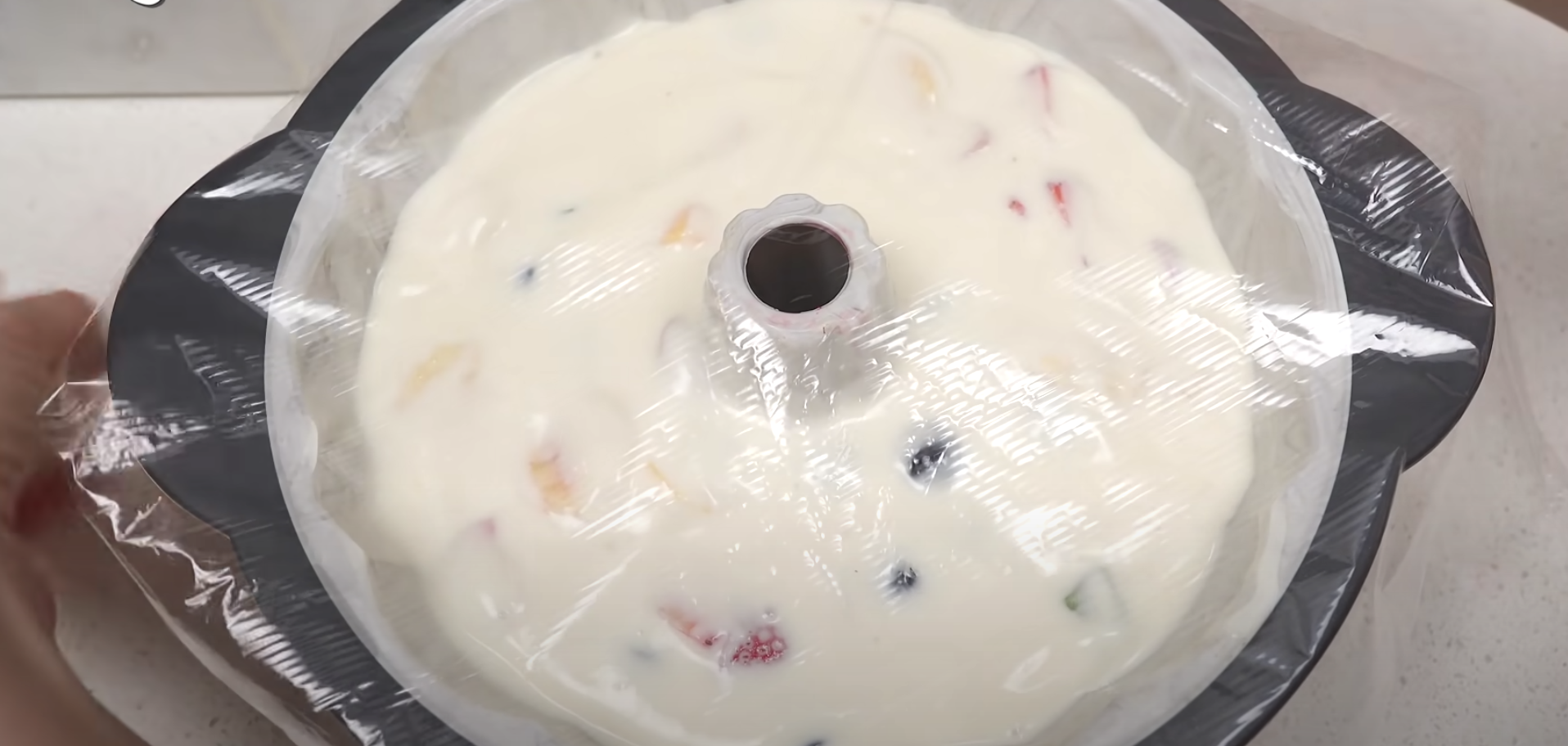 3. W osobnej misce, wymieszaj śmietankę z ekstraktem waniliowym, cukrem i rozpuszczoną żelatyną. Potem zalej masą śmietanową owoce w formie, wygładź i przykryj folią spożywczą. Wstaw do lodówki, do całkowitego stężenia.