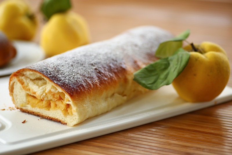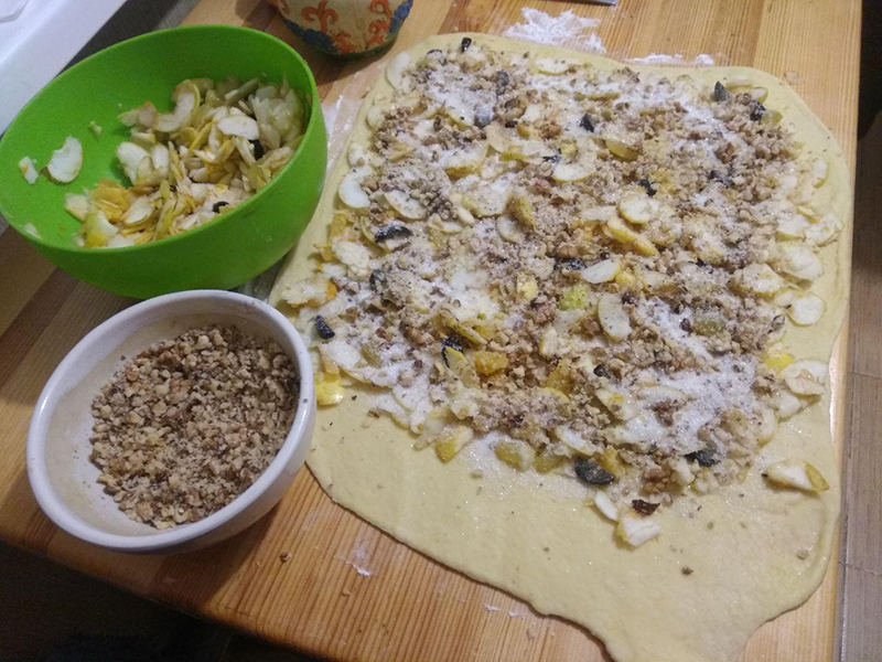 5. Rozwałkuj ciasto na grubość 2-3 mm. Rozłóż nadzienie na cieście i posyp cukrem, jeśli jabłka są kwaśne. Zawiń ciasto w ciasną rolkę i ułóż na blaszce do pieczenia. Posmaruj wierzch olejem. Z podanej ilości składników powinny wyjść 2-3 drożdżówki.