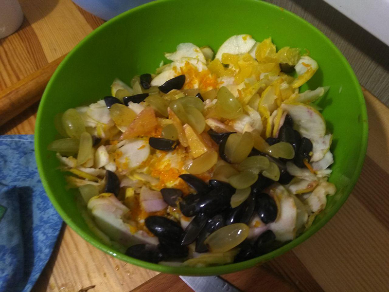 4. Do jabłek dodaj przyprawy, miód, winogrona (połówki), orzechy i skórkę pomarańczową.