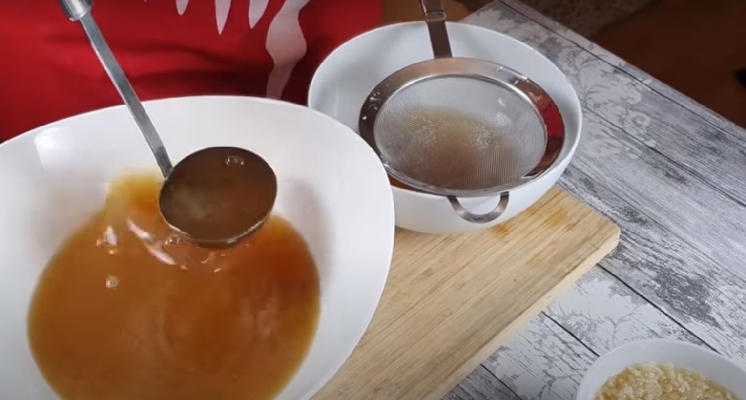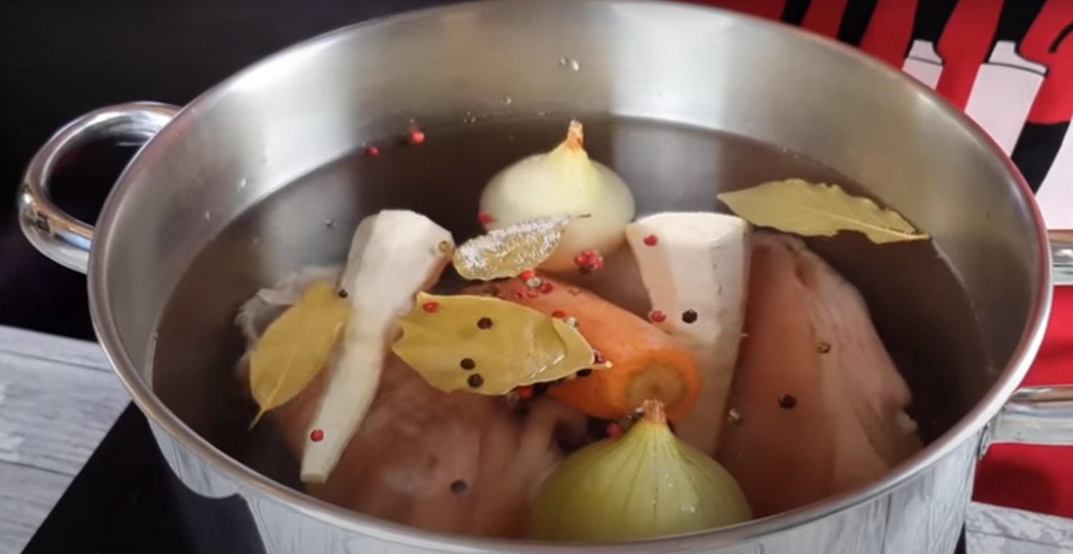 3.Po upływie tego czasu wyjmij wszystko z otrzymanego wywaru. Otrzymany bulion przypraw do smaku pieprzem oraz solą, po czym do miseczki przeciśnij czosnek przez praskę i zalej go dwoma chochlami otrzymanego bulionu na około 5 minut.