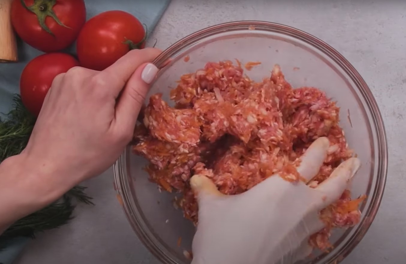 1.  Do miski włóż mięso mielone, następnie dodaj surowy ryż, drobno pokrojony czosnek, cebulkę pokrojoną na małą kosteczkę, oraz startą na dużych oczkach marchew. Dokładnie wymieszaj, po czym wbij jajko oraz przypraw do smaku solą i pieprzem , ponownie całość wymieszaj.