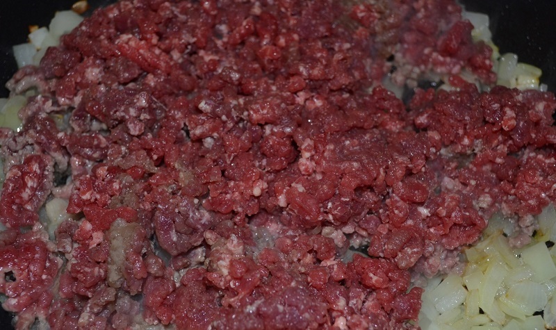 4. Teraz podsmaż ją na rozgrzanej patelni z olejem na złoty kolor. Zarumienioną cebulkę wymieszaj z mielonym mięsem, dopraw do smaku solą, pieprzem i dokładnie wymieszaj.