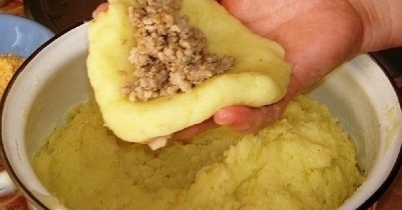 6. Z powstałego ciasta uformuj kulki i rozpłaszcz je w dłoni. Na środku każdej, umieść porcję mięsa i dokładnie owiń je ciastem. Zawijając brzegi do góry, uformuj zgrabne kotleciki.