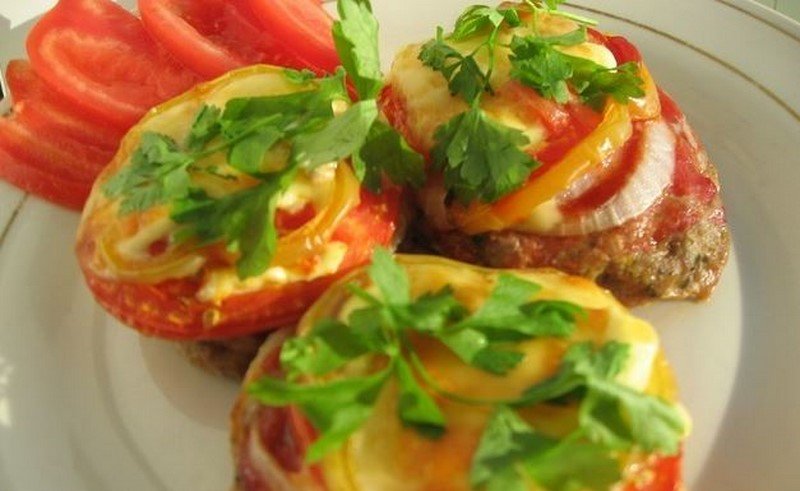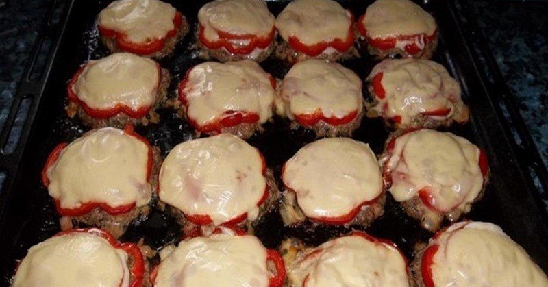 6. Każdy kotlet posmaruj ketchupem i układaj na nim plasterek cebuli, następnie posmaruj majonezem, połóż plasterek pomidora , papryki oraz na wierzch połóż plaster sera.