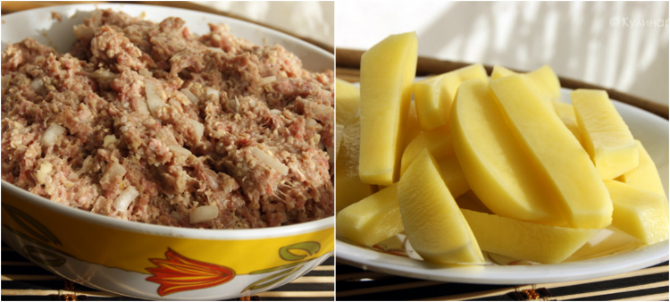 1.  Do miski wlej mleko, następnie dodaj jajka oraz płatki owsiane, całość bardzo dokładnie połącz ze sobą. Do drugiej miski przełóż mielone mięso, po czym dodaj drobno posiekany czosnek oraz cebulę, całość przypraw szczypta soli, pieprzu, po czym dodaj wcześniej przygotowane płatki owsiane. Tak przygotowane składniki połącz ze sobą. Umyte oraz obrane ziemniaki, pokrój na cienkie słupki.
