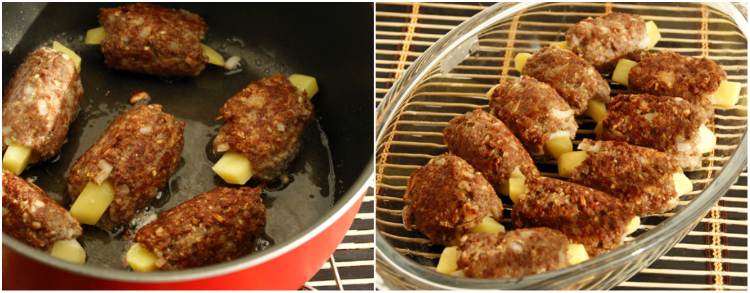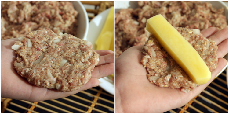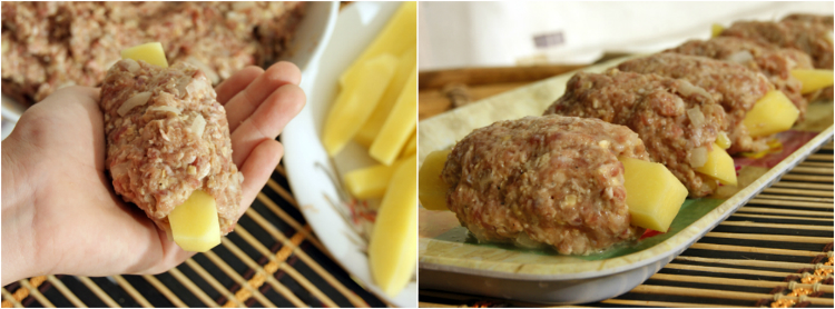 2. Z przygotowanego mięsa uformuj kulki, następnie lekko je rozpłaszcz w dłoni. Gotowe słupki z ziemniaków wkładaj w mięso, po czym szczelnie całość zwiń.