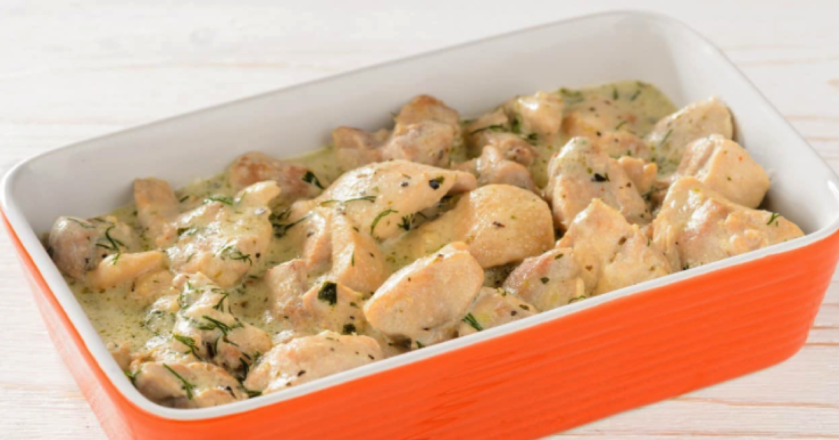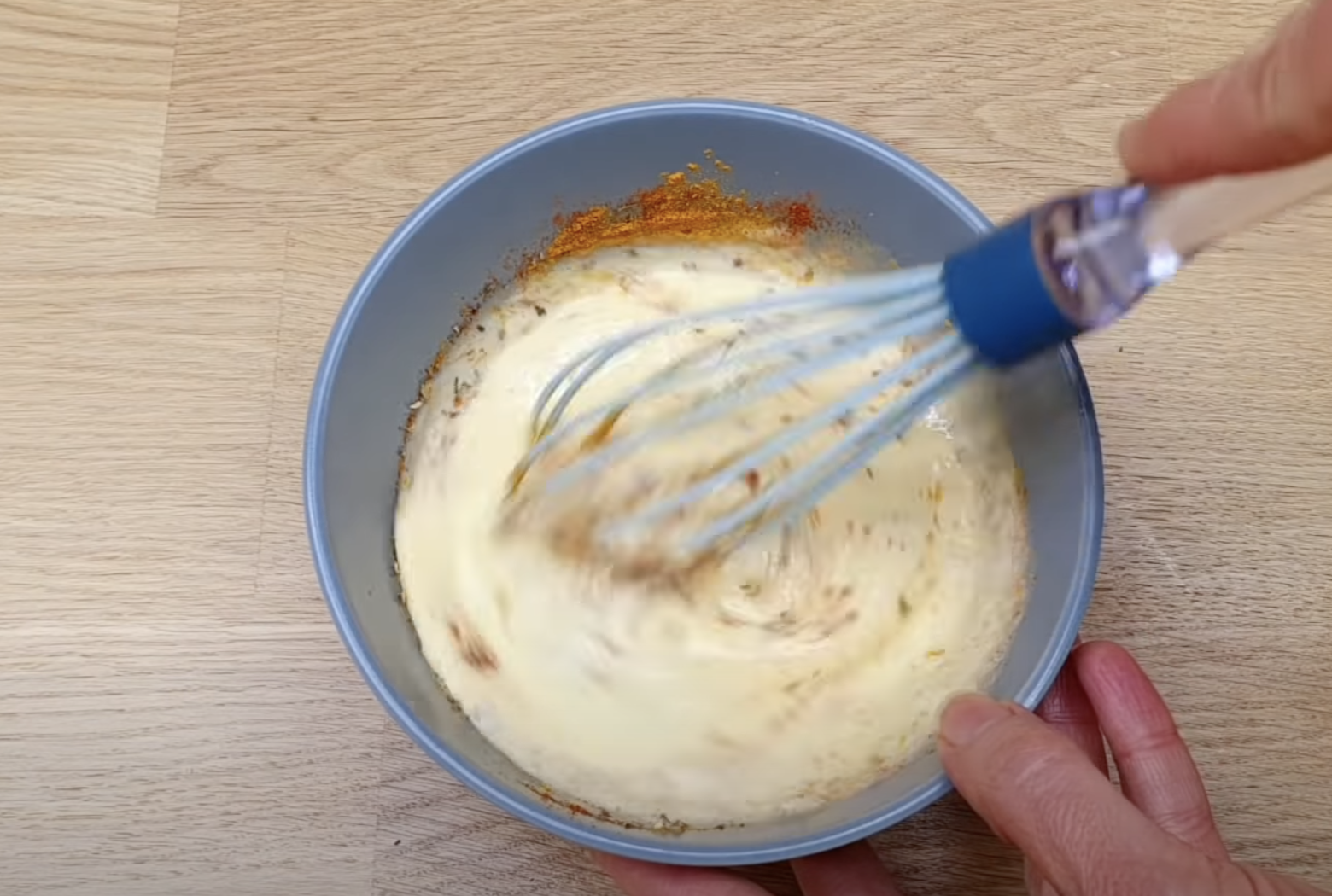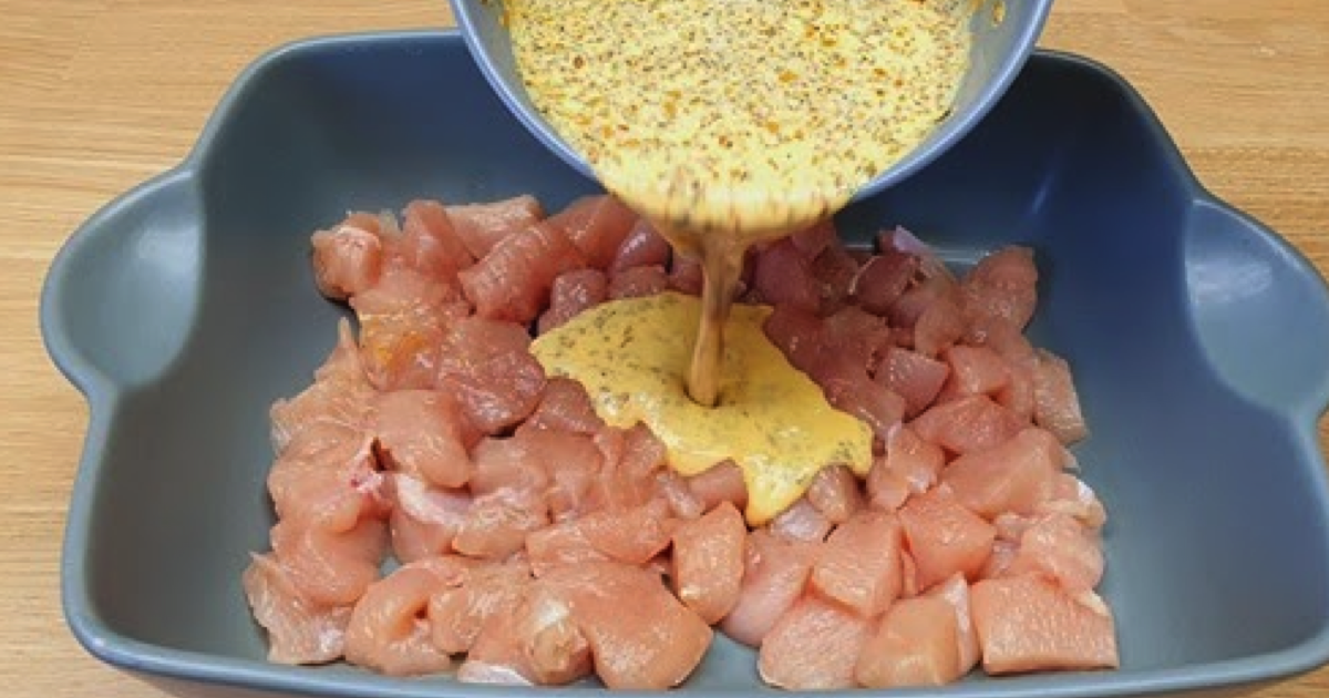 1. Filety z kurczaka umyj, osusz ręcznikiem papierowym i pokrój w dużą kostkę. Potem, przełóż go do naczynia żaroodpornego, wysmarowanego olejem. W misce, wymieszaj śmietanę z musztardą, przyprawą do gyrosa oraz przeciśniętym przez praskę czosnkiem.