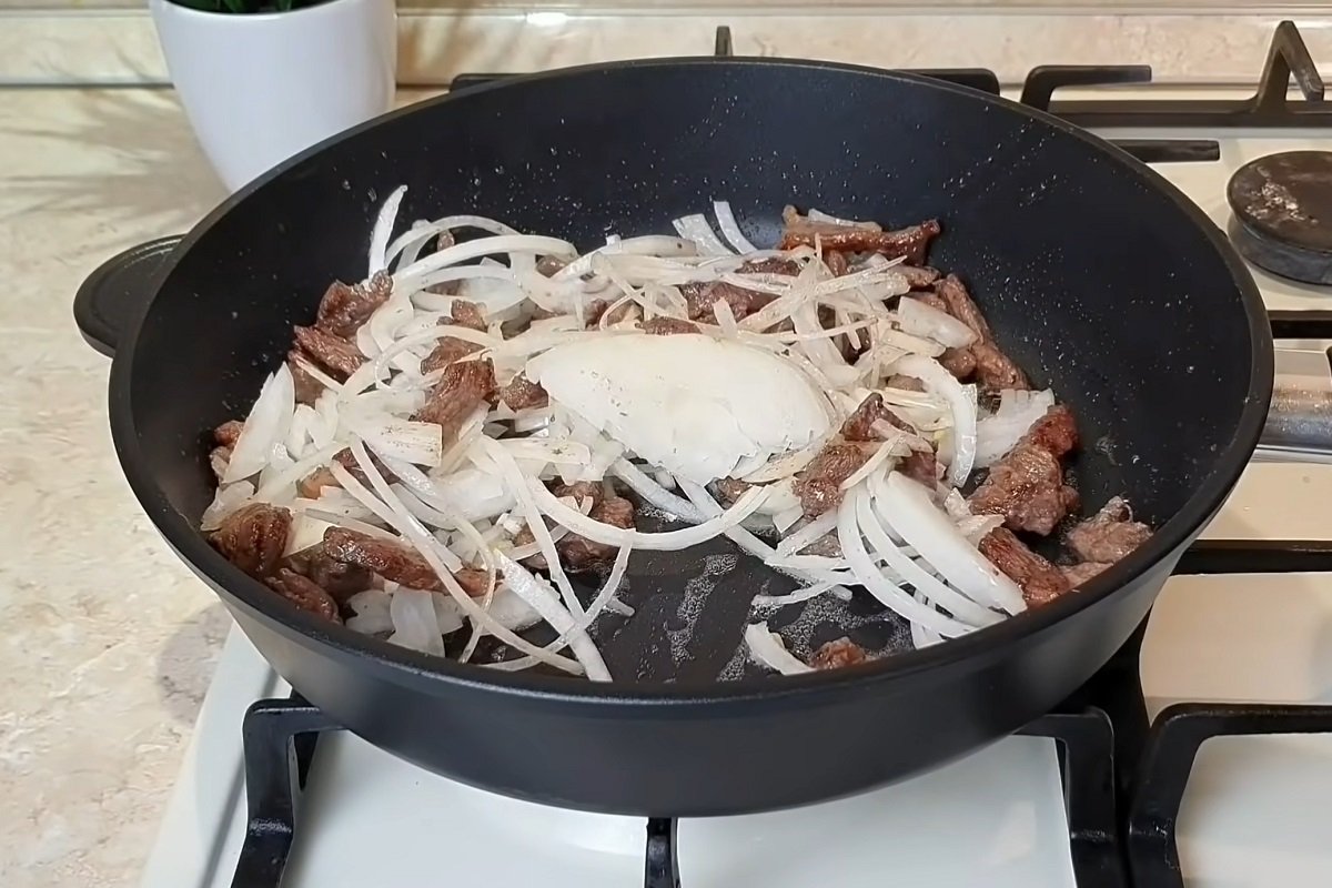 Do mięsa dorzuć cebulę, którą wcześniej pokrój w półksiężyce i podsmaż, pamiętaj od czasu do czasu mieszaj.