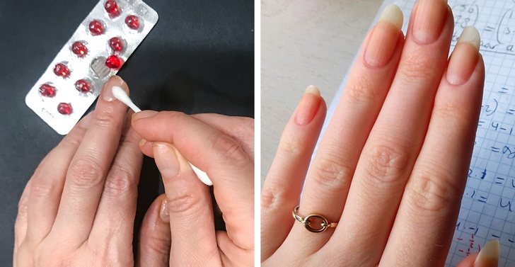Łatwo dostępną w aptece kapsułkę witaminy E, wyciśnij na płytkę paznokciową i rozprowadź patyczkiem do uszu. Witamina E wspomaga krążenie krwi, wzrost paznokcia, a także regeneruje osłabione i kruche paznokcie. Poprawia również kondycję płytki paznokcia i łożysko paznokcia (tkankę znajdującą się bezpośrednio pod paznokciem).