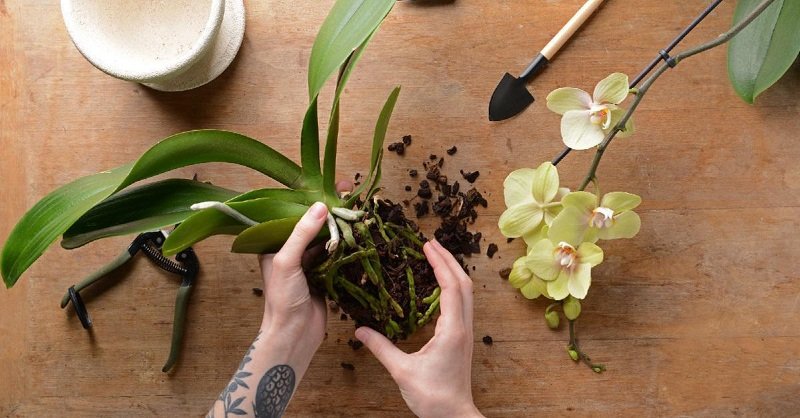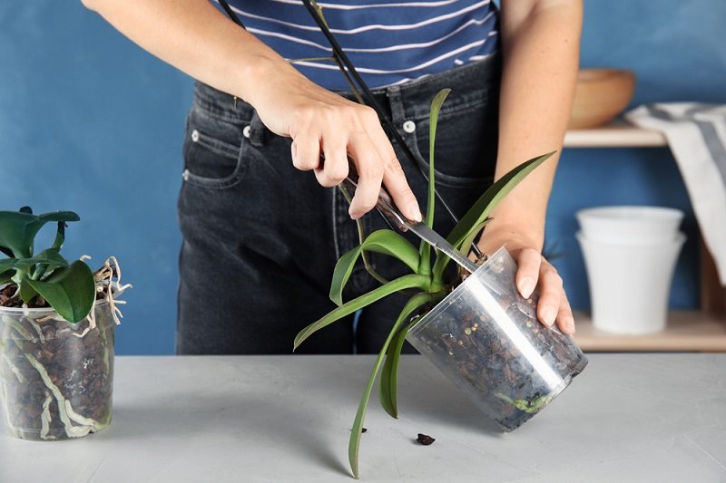 Wyjmij roślinę z doniczki i delikatnie otrząśnij ją z podłoża. Obejrzyj dokładnie cały system korzeniowy i usuń wszystkie stare i uszkodzone korzenie, zarówno wewnętrzne, jak i powietrzne.