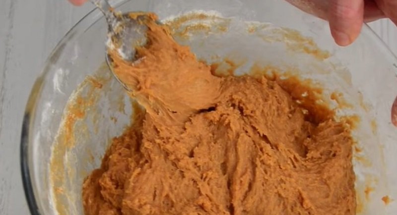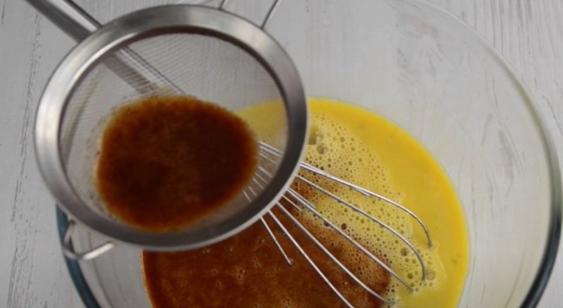 Teraz w osobnej dużej misce ubijamy jajko i dodajemy masę karmelową, po czym mieszamy mikserem do uzyskania jednolitej gładkiej masy.