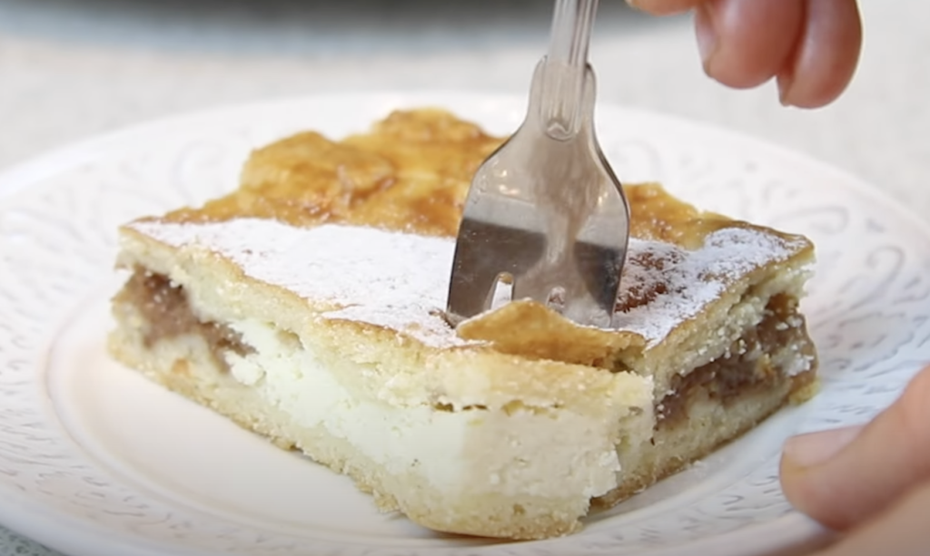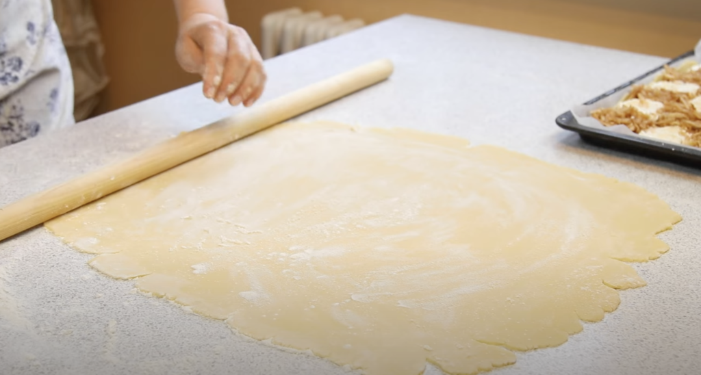 Drugą połowę ciasta rozwałkuj i połóż delikatnie na warstwie nadzienia. Ciasto nie powinno nigdzie wystawać poza blachę. Jeśli tak się dzieje, to obetnij delikatnie te kawałki nożem i połóż na wierzchu ciasta.