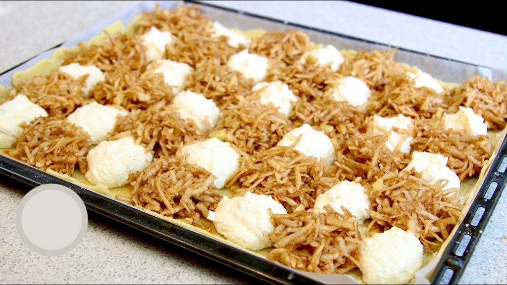 Przygotuj blachę i wyłóż ją papierem do pieczenia. Następnie ułóż na niej rozwałkowane wcześniej ciasto. Posyp delikatnie mąką. Podczas nakładania nadzienia postaraj się ułożyć na cieście wzór szachownicy. Na zmianę nakładaj na ciasto łyżkę masy jabłkowej oraz łyżkę masy serowej.