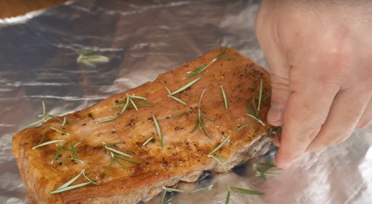 Wstaw do wcześniej nagrzanego piekarnika na około 30-40 minut na środkowy ruszt. Po tym czasie posyp podpieczone mięso rozmarynem i zawiń je dokładnie w folię aluminiową. Następnie piecz dalej w piekarniku przez 50-60 minut.