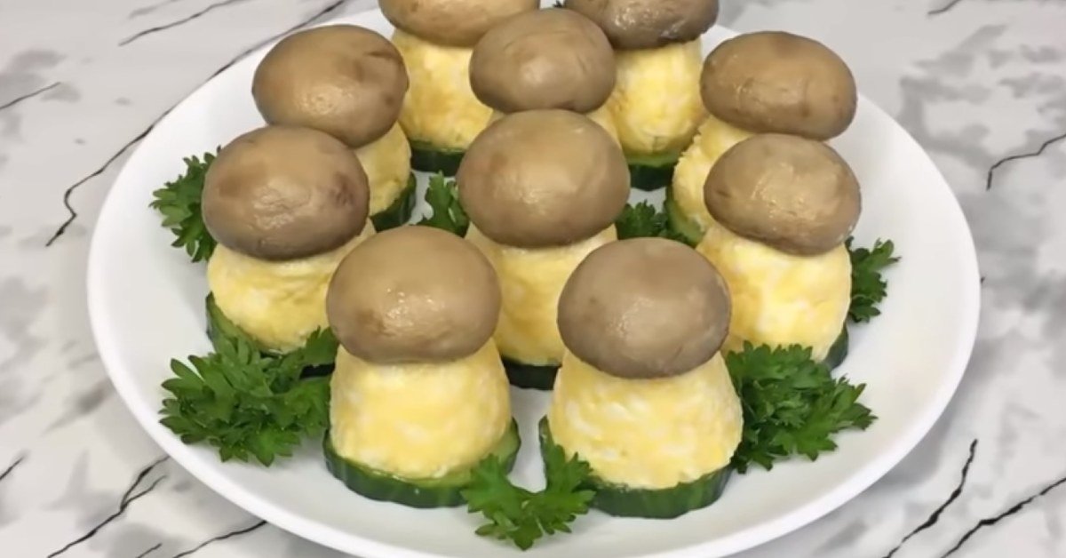 Następnie trzeba pokroić w grube plastry ogórka i wyciągnąć „nóżki” z pieczarek w taki sposób, aby dno zostało całe.