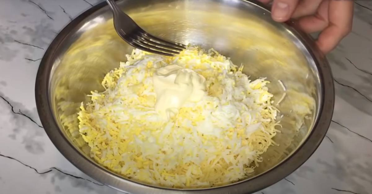 Na początku należy ugotować jajka na twardo, ostudzić je, a później zetrzeć na tarce razem z serem, do wszystkiego dodać sól, majonez oraz czosnek.