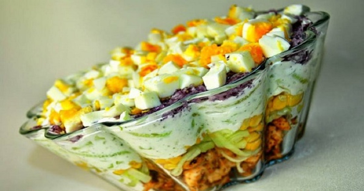 4. Z przygotowanych składników zacznij układać warstwy, Na samym początku połóż kurczak, następnie por, kukurydza całość polej sosem Tzatziki, po czym połóż na niego cebulę oraz jajka. Tak przygotowana sałatka jest gotowa!