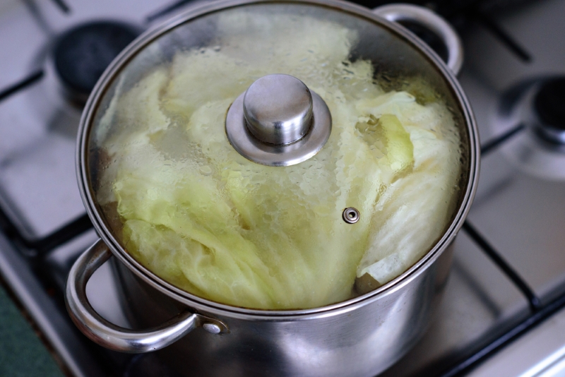 1. We wrzącej wodzie zaparzaj kapustę, do momentu aż liście zaczną odchodzić.