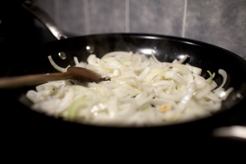 4. Na patelni podsmaż obraną oraz drobno pokrojoną cebulę.
