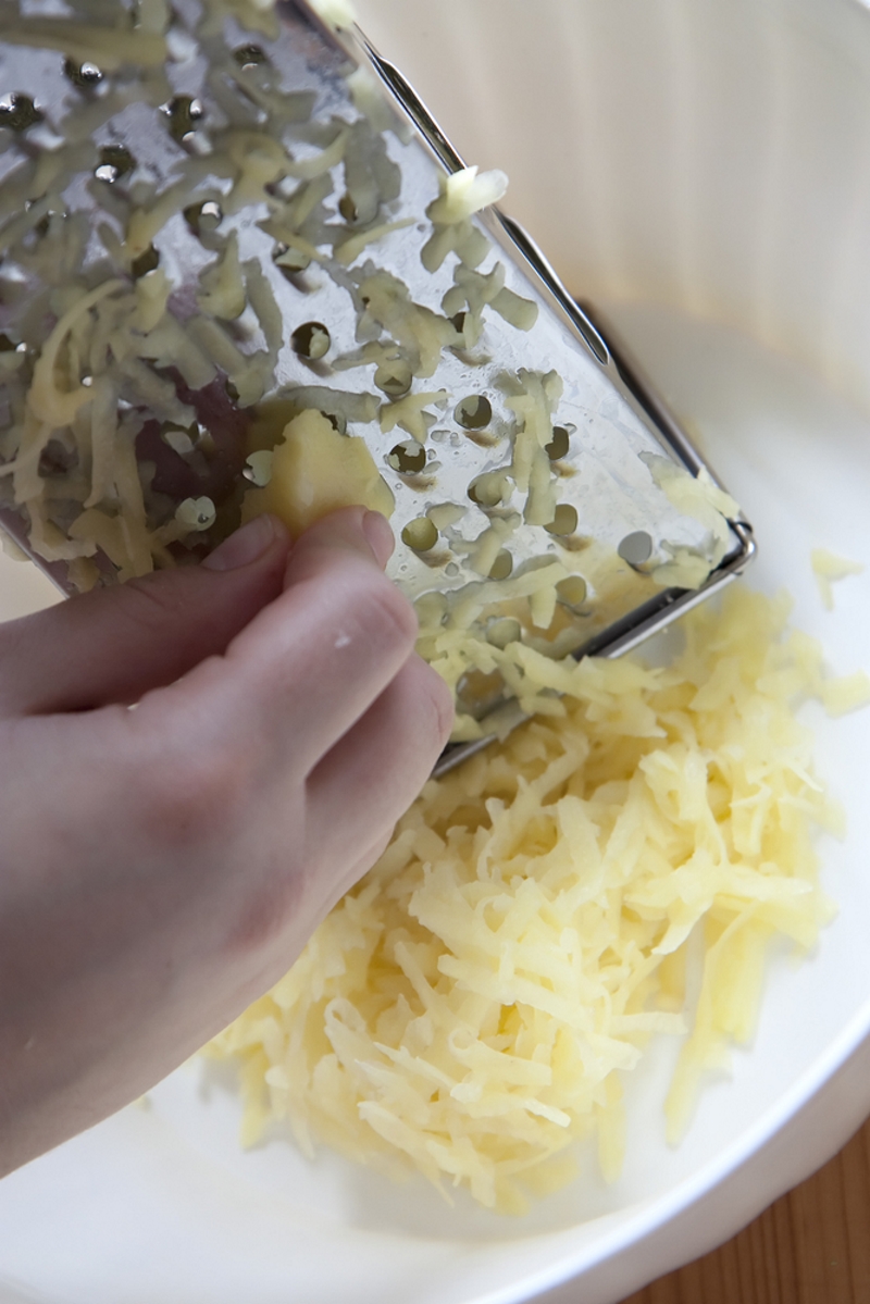 6. Po kilku minutach dodaj na patelnię także starte za pomocą tarki obrane ziemniaki. Całość przypraw solą oraz pieprzem , po czym dokładnie wymieszaj.