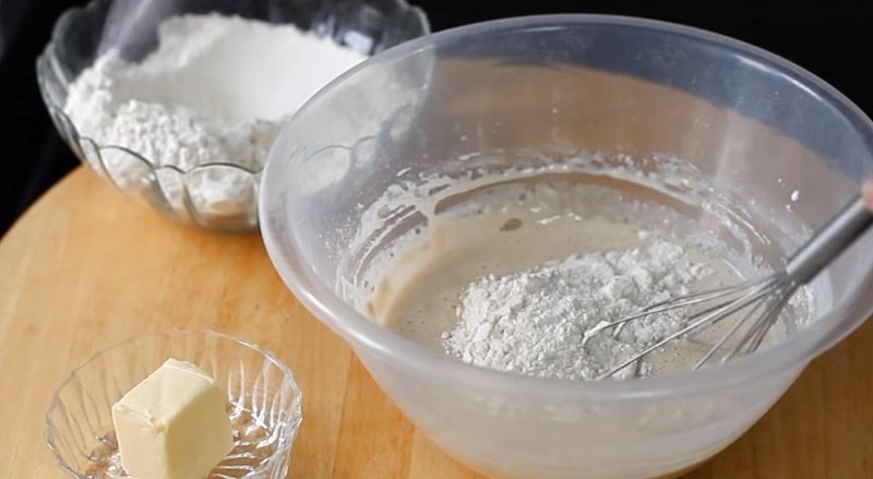 1. Do szklanki wlej ciepłe mleko, po czym rozpuść w nim suche drożdże, następnie dodaj łyżkę cukru oraz 2 łyżki mąki. Całość wymieszaj, po czym pozostaw na 15 minut w ciepłym i nie przewiewnym miejscu.