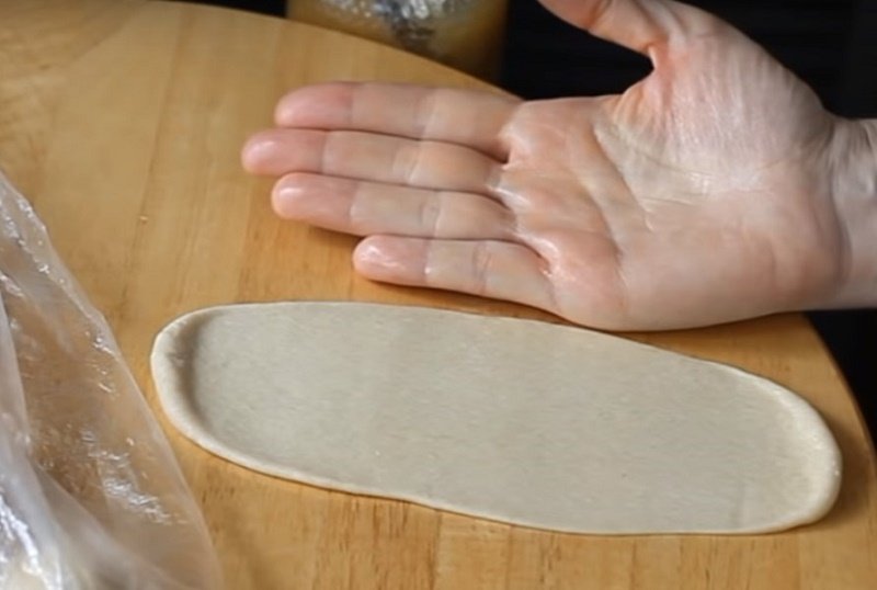 5. Po tym czasie rozwałkuj kulki na podłużny placek, który powinien być dłuższy niż Twoja dłoń.