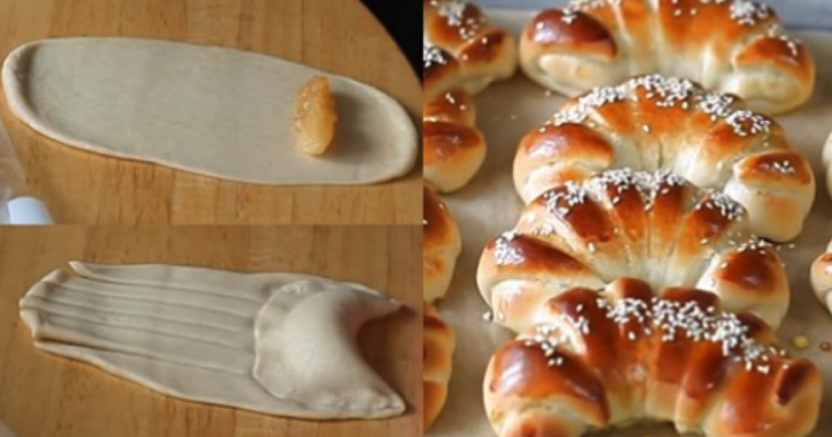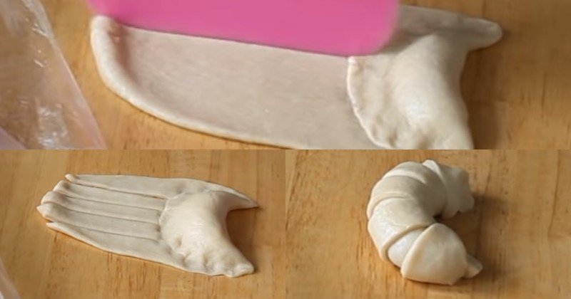 6. Na każdy brzeg placka nakładaj dżem , następnie powoli zwijaj , po czym dokładnie sklej brzegi. Pozostałą część ciasta ponacinaj tak jak na zdjęciu poniżej , po czym owijaj tym ciastem całego rogalika.