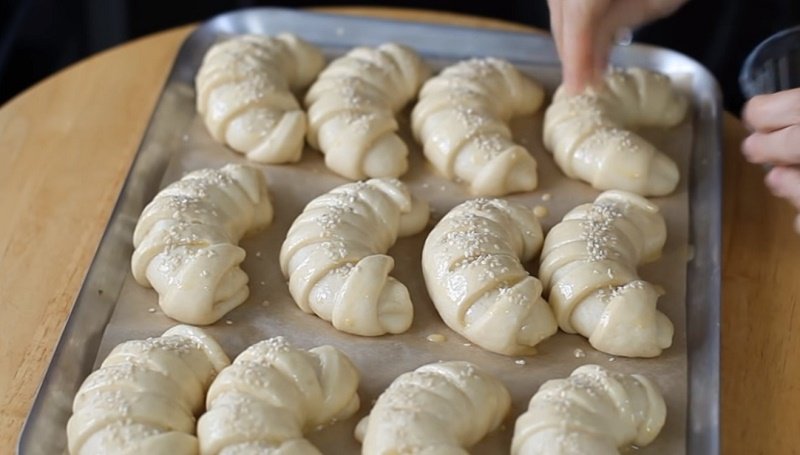 7. Tak przygotowane rogaliki wyłóż na blachę, którą wcześniej pokryj papierem do pieczenia i pozostaw tak na około 15 minut. Każdy rogalik posmaruj roztrzepanym jajkiem , po czym wierzch posyp cukrem lub sezamem.