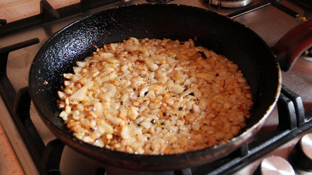 4.Po tym czasie włóż także na patelnię wcześniej przygotowane mięso. Gdy przyprawiasz solą mięso, pamiętaj, aby nie dawać jej dużo , gdyż cebula także była solona.
