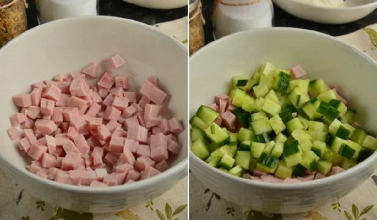 1. Połącz ze sobą połowę pokrojonego ogórka oraz szynki.