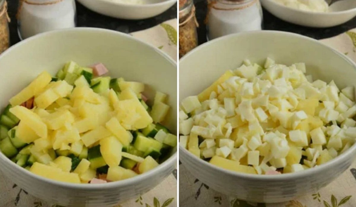 2. Następnie dodaj do nich pokrojone ziemniaki. Dodaj także pokrojone w kosteczkę białka. Wymieszaj ze sobą składniki.