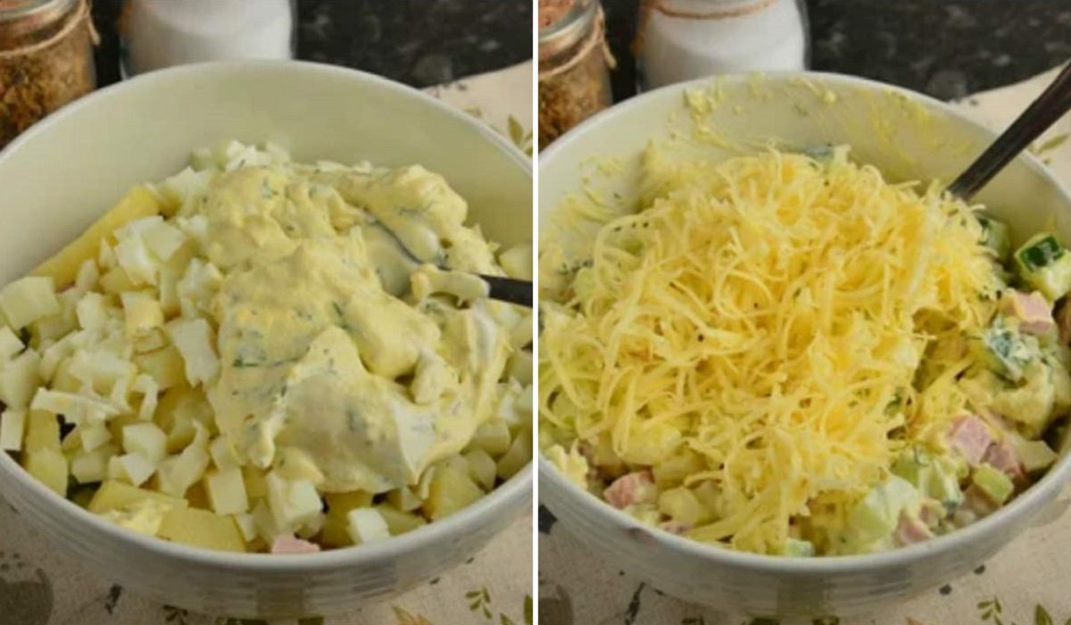 4. Do wcześniej przygotowanych składników dodaj sos oraz starty ser , po czym połącz ze sobą wszystkie składniki. Tak przygotowana sałatka jest gotowa!