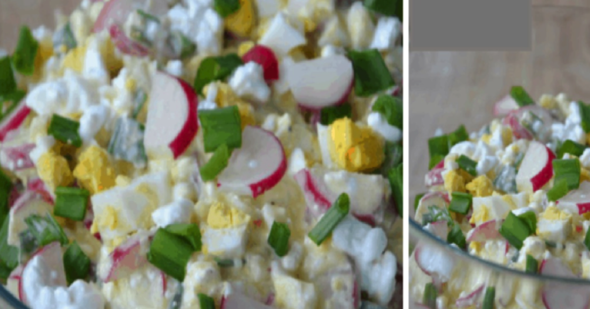 1. Jajka ugotuj na twardo, a następnie obierz i pokrój w kosteczkę. Twaróg przełóż na drobne sitko i odciśnij dobrze wodę. Sałatka nie powinna być mokra.