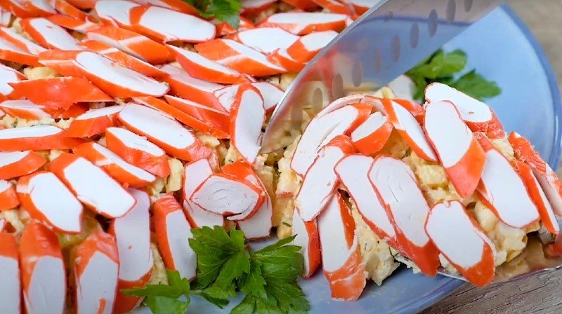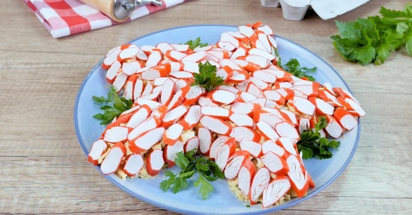 3.Zabierzmy się za paluszki krabowe – należy je pokroić na skos w plasterki. Około 160 gram zostaw do ozdoby. Resztę drobno posiekaj i dodaj do reszty sypkich składników.