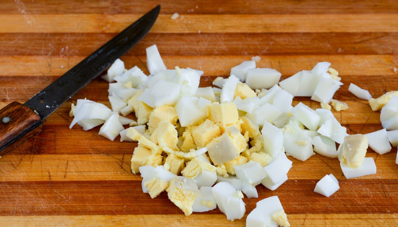 Na twardo gotujemy jajka. Po ugotowaniu odłóż i poczekaj, aż będą zimne. Obierz ze skórki i pokrój w kostkę.